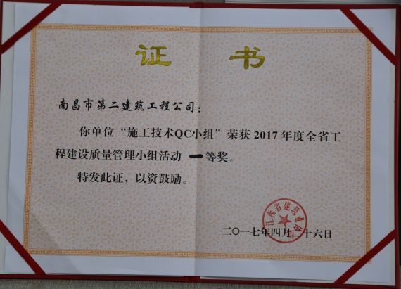 技術(shù)質(zhì)檢部貫徹公司質(zhì)量標(biāo)準(zhǔn)化管理精神,以切實(shí)提高工程質(zhì)量為目標(biāo),積極開展全面質(zhì)量管理技術(shù)攻關(guān)活動,所撰寫的《提高GC泡沫水泥保溫板外墻外保溫施工質(zhì)量 》QC課題成果,榮獲“2017年度全省工程建設(shè)優(yōu)秀質(zhì)量管理小組活動一等獎”。