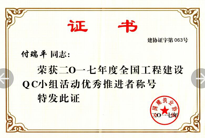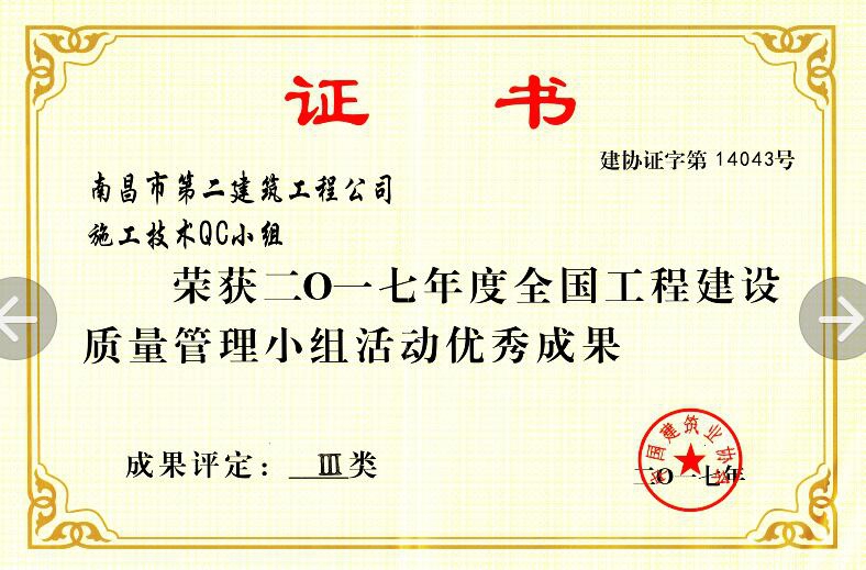 在中國(guó)建筑業(yè)協(xié)會(huì)組織的2017年度QC成果發(fā)布會(huì)上,公司QC小組的《提高GC發(fā)泡水泥保溫板外墻外保溫施工質(zhì)量》成果榮獲2017年度全國(guó)工程建設(shè)質(zhì)量管理小組活動(dòng)優(yōu)秀成果獎(jiǎng);付瑞平同志榮獲2017年度全國(guó)工程建設(shè)QC小組活動(dòng)優(yōu)秀推進(jìn)者稱號(hào)。